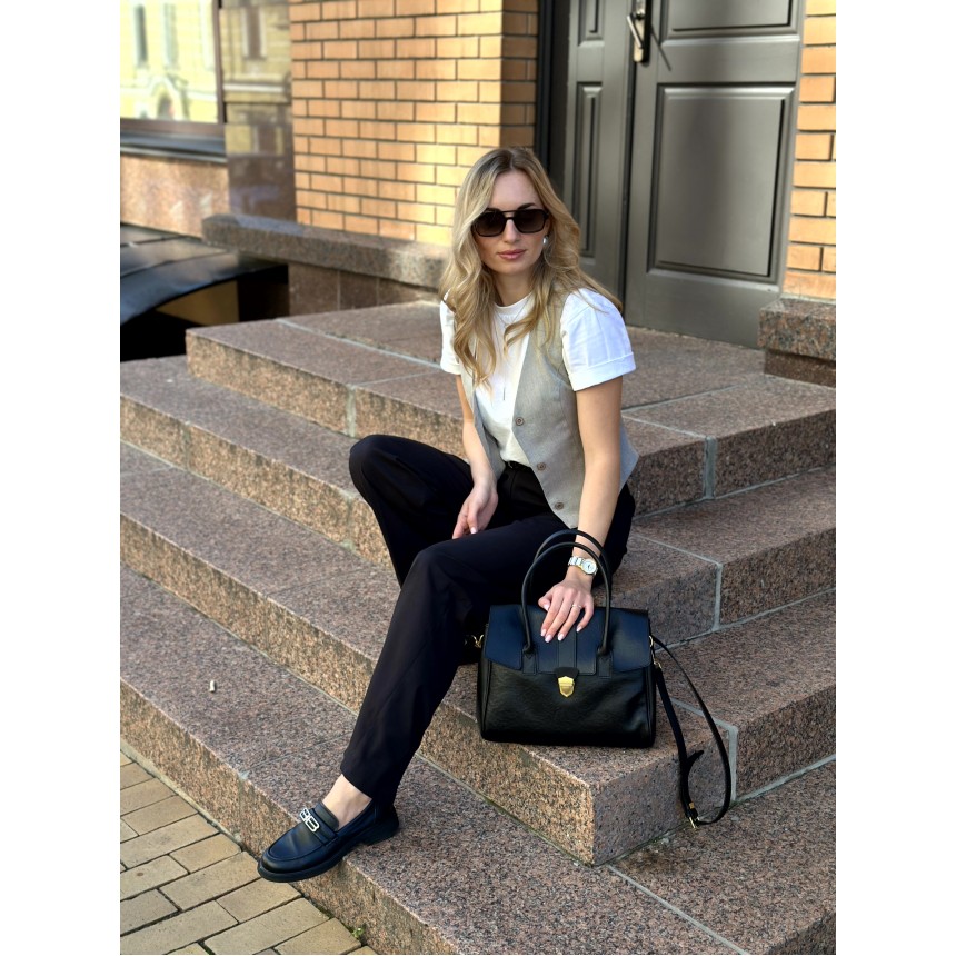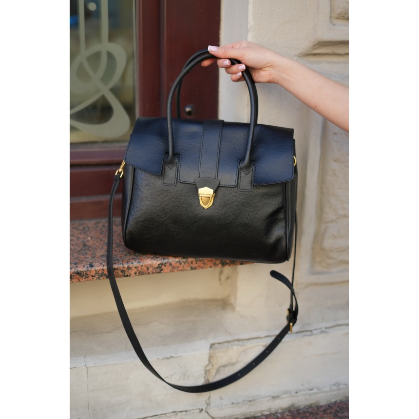 В основе сумки — натуральная гладкая кожа благородного черного цвета, отличающаяся устойчивостью к износу и сохраняющая безупречный вид даже после интенсивного использования. Приятная на ощупь текстура подчеркивает статус, а тщательно подобранные материалы обеспечивают уверенность в качестве. Золотистая фурнитура создает контрастный акцент, визуально выделяя детали и в то же время гармонично вписываясь в общий дизайн. Клапан с двумя декоративными вертикальными ремешками и аккуратными пряжками добавляет структурности, что особенно актуально для делового аксессуара. Застежка надежно защищает вещи, что позволяет не отвлекаться на мелочи даже во время самого динамичного дня.