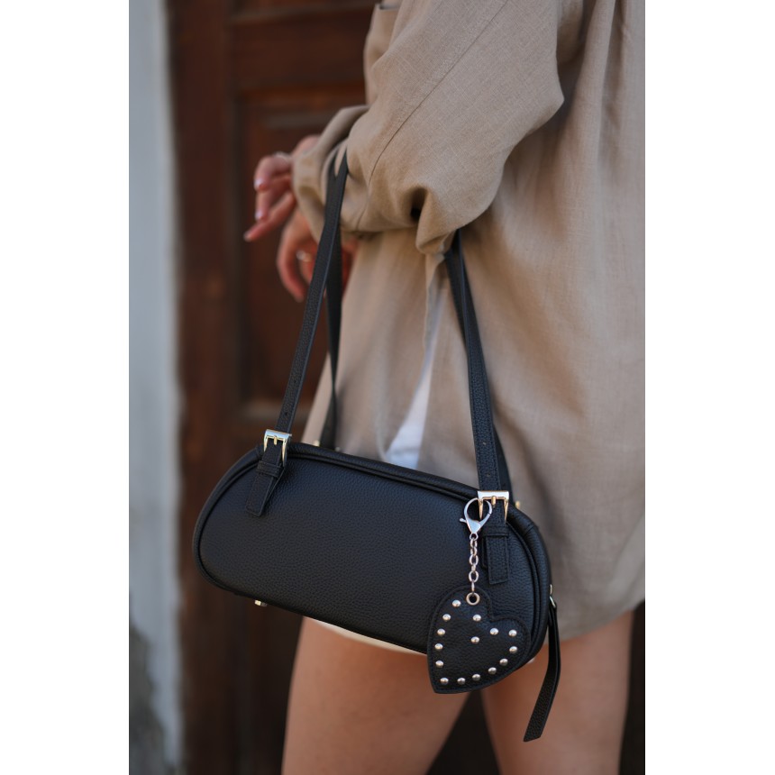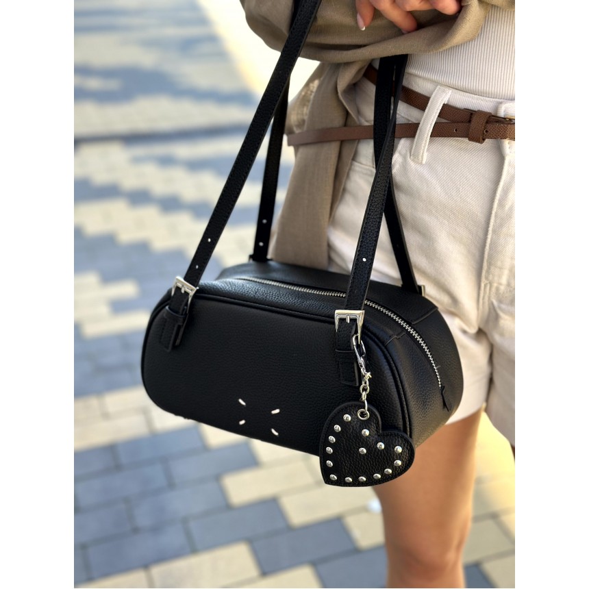 Дизайн намекает на молодёжную уверенность и смелость: сумка украшена фирменным брелоком в форме сердца с металлическими заклёпками, что добавляет лёгкого характера ежедневным образам. Силуэт уравновешенной цилиндрической формы подчёркивает индивидуальность, а изысканные линии позволяют выглядеть актуально в любой ситуации — от прогулок по городу до неформальных встреч.