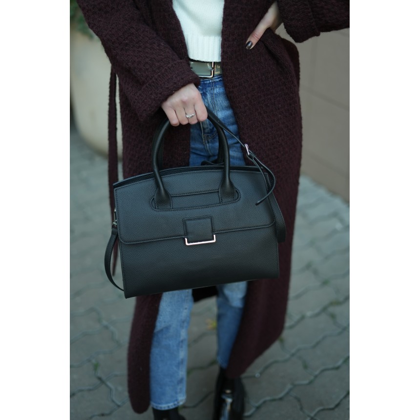 Вивірений дизайн відповідає сучасним тенденціям: чіткі геометричні лінії, відсутність надмірностей і декоративна стриманість створюють вишуканий силует. Декоративний ремінець із металевою пряжкою спереду додає акценту, підкреслюючи унікальність цієї моделі. Лаконічна нікелева фурнітура гармонійно поєднується з глибоким чорним кольором, додаючи стриманої елегантності.